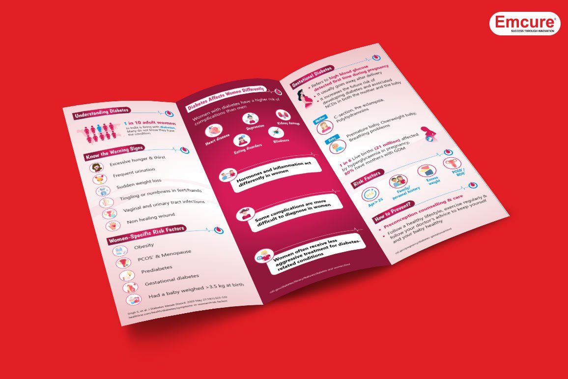 An Infographic Leave Behind Brochure about DIabetes Awareness in Women . This paient awareness campaign was created primarily to help diabetic women become more aware of various health issues. We have created posters, leaflets, brochures, etc for different complication's related to women. Nowadys fast facts and infographics are easy for readers to break down, making the benefits of your produc clear. Hence, our leave behind literatures are playing an important role